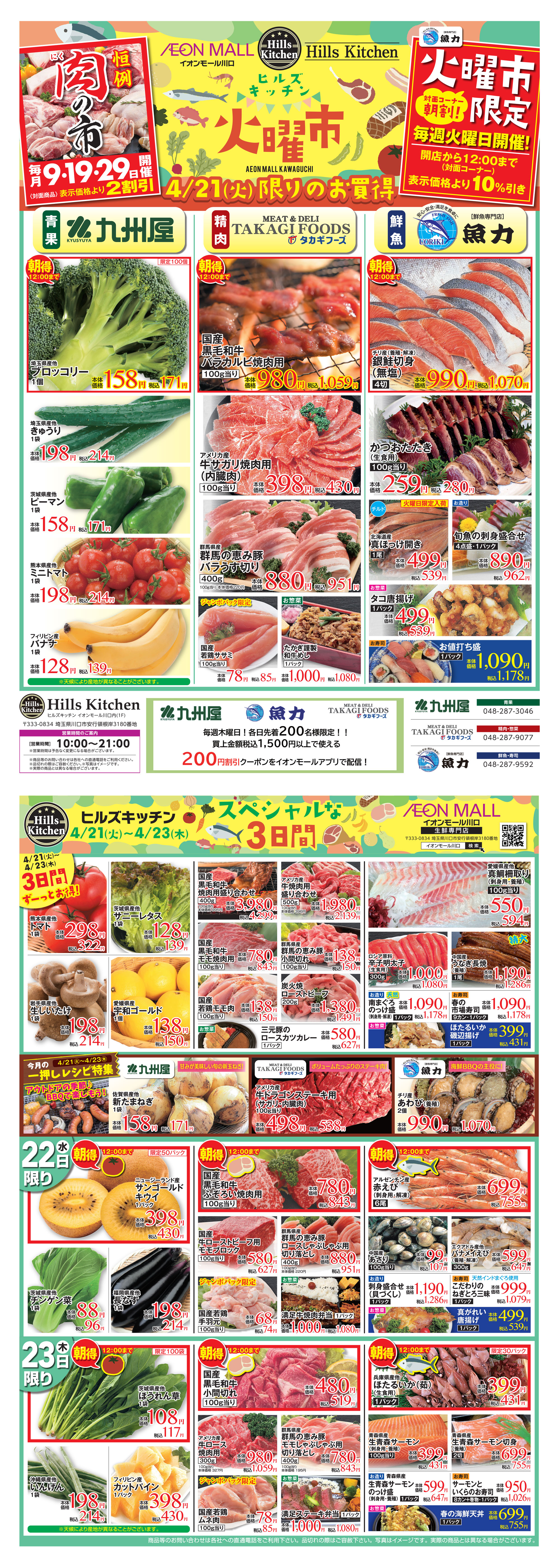 ヒルズキッチン お得な3日間!4月21日(火)~4月23日(木)